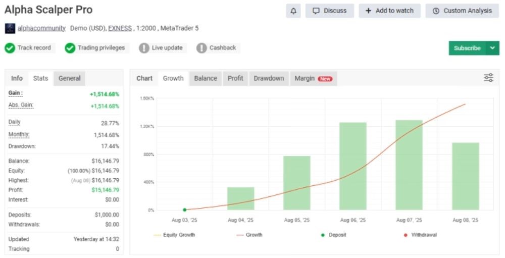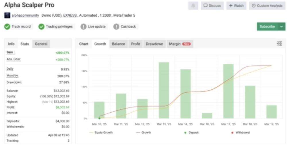 Alpha Scalper Pro is an advanced MT5 Expert Advisor only dedicated to spot gold scalping on XAUUSD, developed specifically for the M15 timeframe. It excels under chaotic market conditions by selling and purchasing at lightning speed via real market action rather than relying solely on indicators. Highly automated and ideal for prop firm as well as retail account use, it provides traders with a plug-and-play, turn-key system for consistent, reliable results.