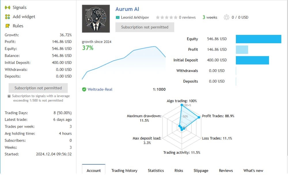 Aurum AI EA is a very professional Expert Advisor developed to trade gold on the MetaTrader 4 platform. It is a very efficient assistant in analyzing trends and maintaining stability by controlling the risk of loss, powered by advanced artificial intelligence, making it an ideal tool for traders seeking efficiency and consistency in profits. With a focus on tight risk management and proof of profitability, Aurum AI EA has shown some remarkable trading performance and can be considered one of the sophisticated tools to dominate the Gold market with stability and precision.