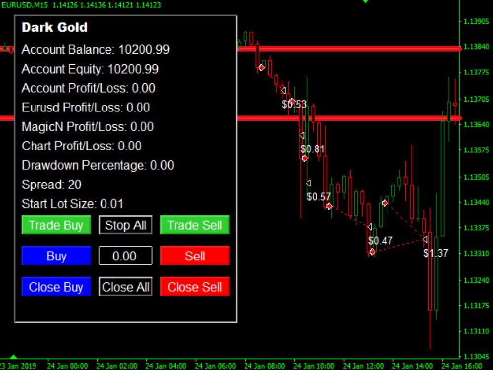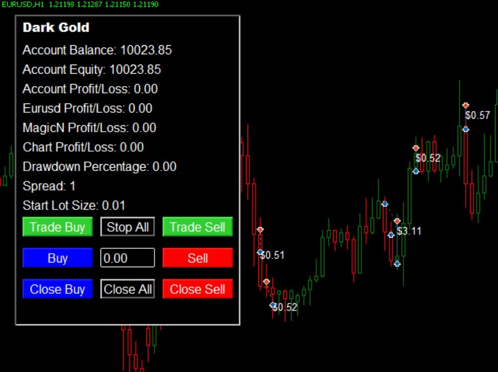 - Timeframes & Instruments: Dark Gold can be employed for M5, M15, H1, etc., timeframes if well set up. It specifically works well for Gold (XAUUSD), Bitcoin (BTCUSD), EURUSD, and GBPUSD, but can be modified for other instruments by making proper settings.