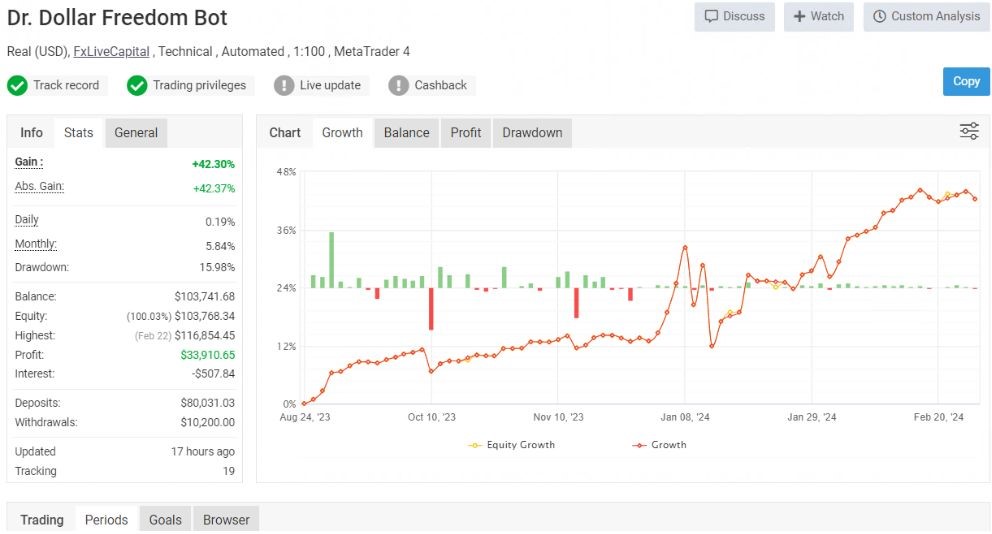 Freedom Pro EA is an expert advisor (EA) crafted for the MetaTrader 4 (MT4) platform. Leveraging advanced algorithms, it autonomously analyzes market trends and executes trades. This EA is designed to liberate traders from continuous monitoring by efficiently implementing their trading strategies. It empowers both novice and experienced traders with professional trading capabilities, enabling them to navigate the Forex market confidently and effortlessly.