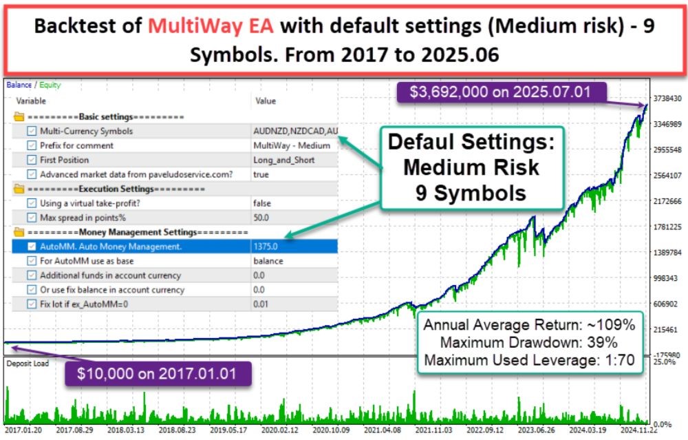 MultiWay EA is a highly advanced automated trading system with a strong mean-reversion approach. It trades nine of the most correlated currency pairs to benefit from price reversals following high directional movement. The EA emphasizes simplicity, stability, and precision and is suitable for both amateur and professional traders. Providing flexible money management and inbuilt risk control, MultiWay EA is a balanced and stable trading experience.